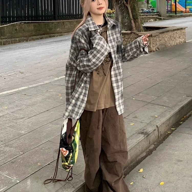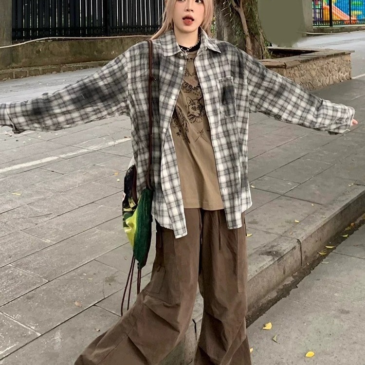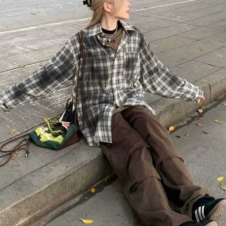American plaid shirt women's early autumn dirty dyed plaid shirt boyfriend style jacket oversize loose couple top
