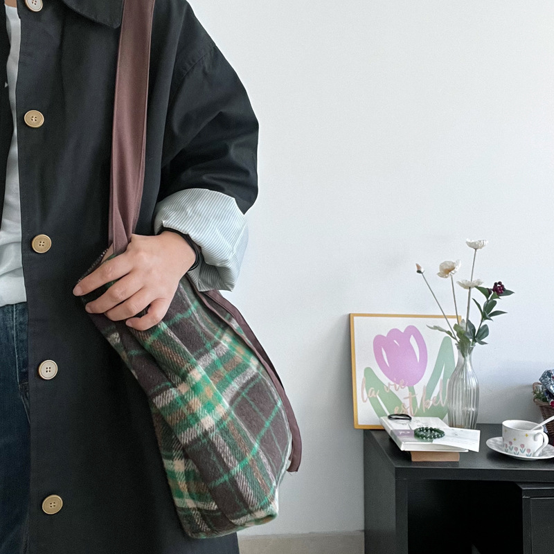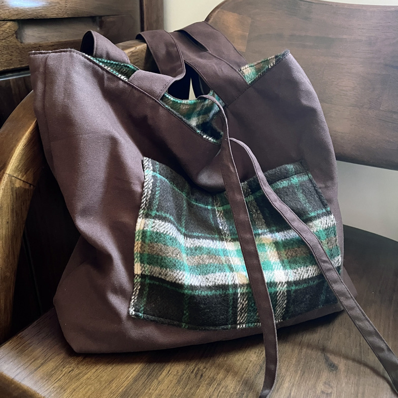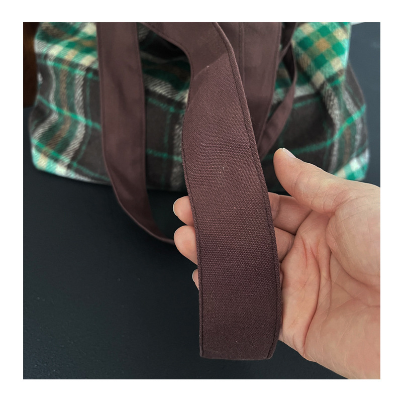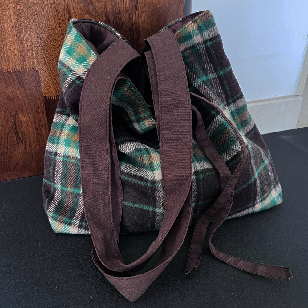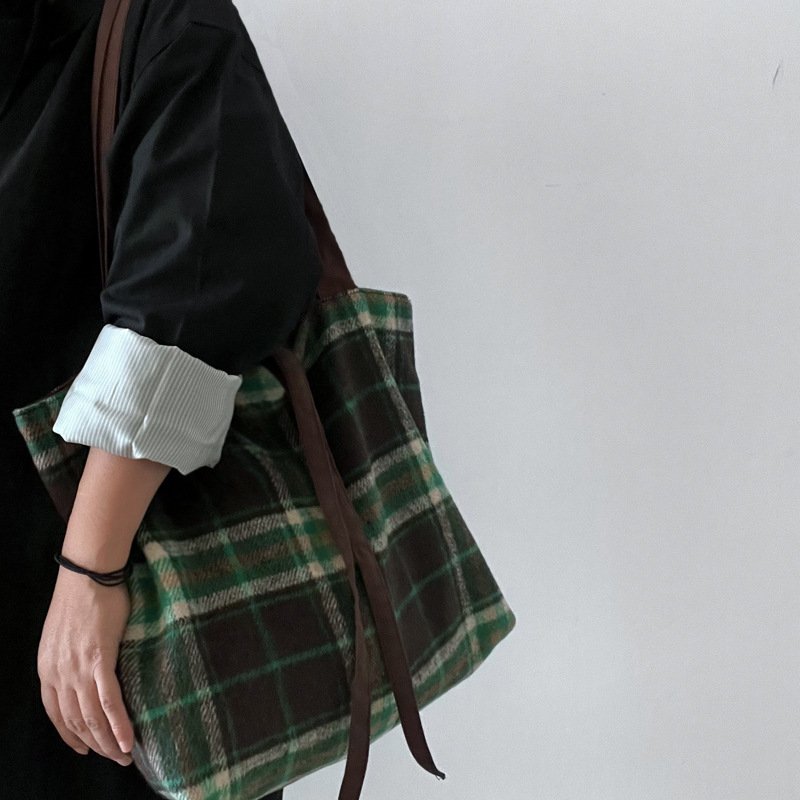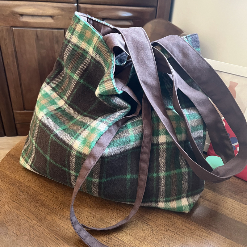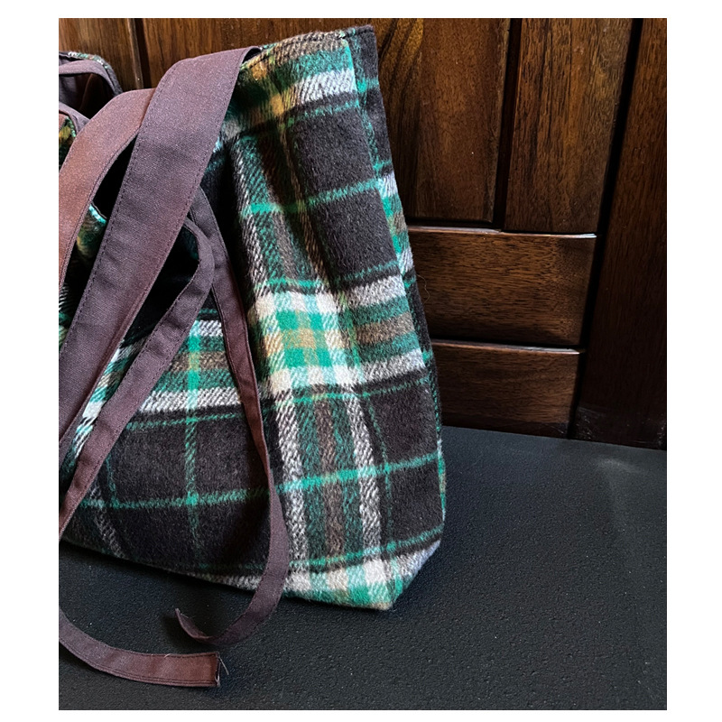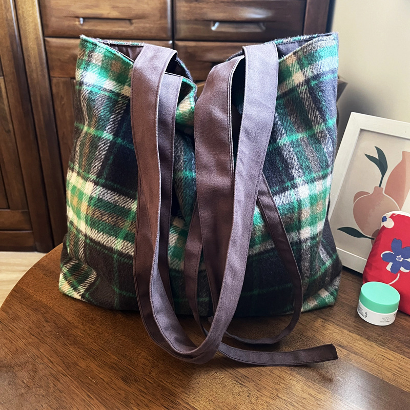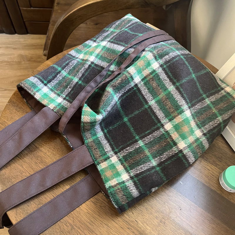 Autumn and winter woolen green plaid bag large-capacity tote bag double-sided back canvas shoulder bag women's bag