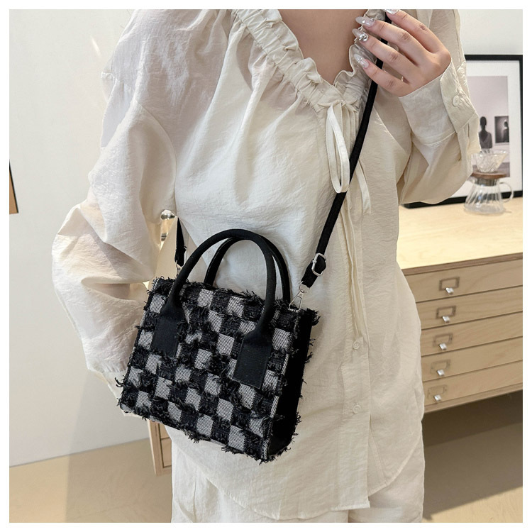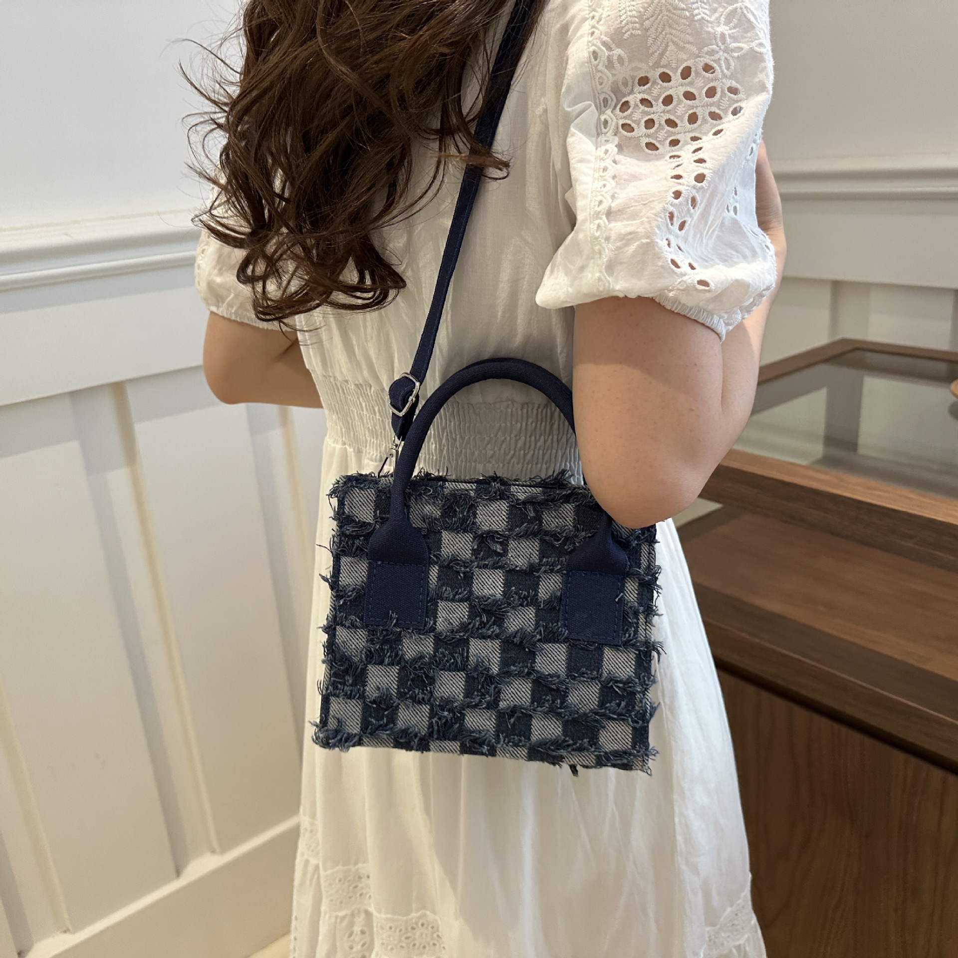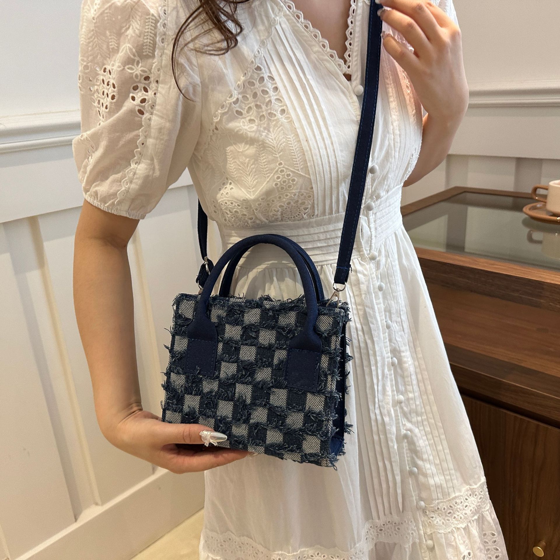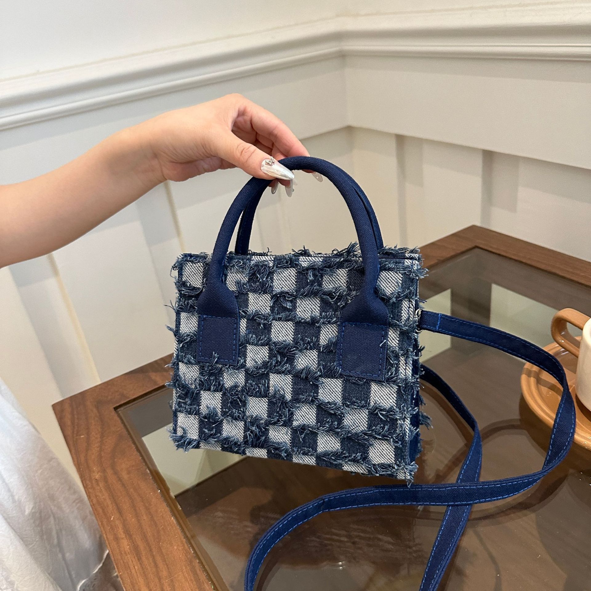 Denim bag women plaid contrasting color 2024 spring new handbag retro Mori fringed Mao Mao small square bag