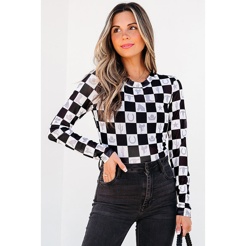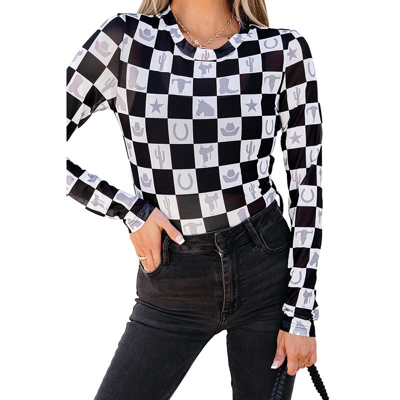 European and American fashion plaid color matching crew neck bottoming shirt women's spring new trend niche slim-fitting long-sleeved T-shirt