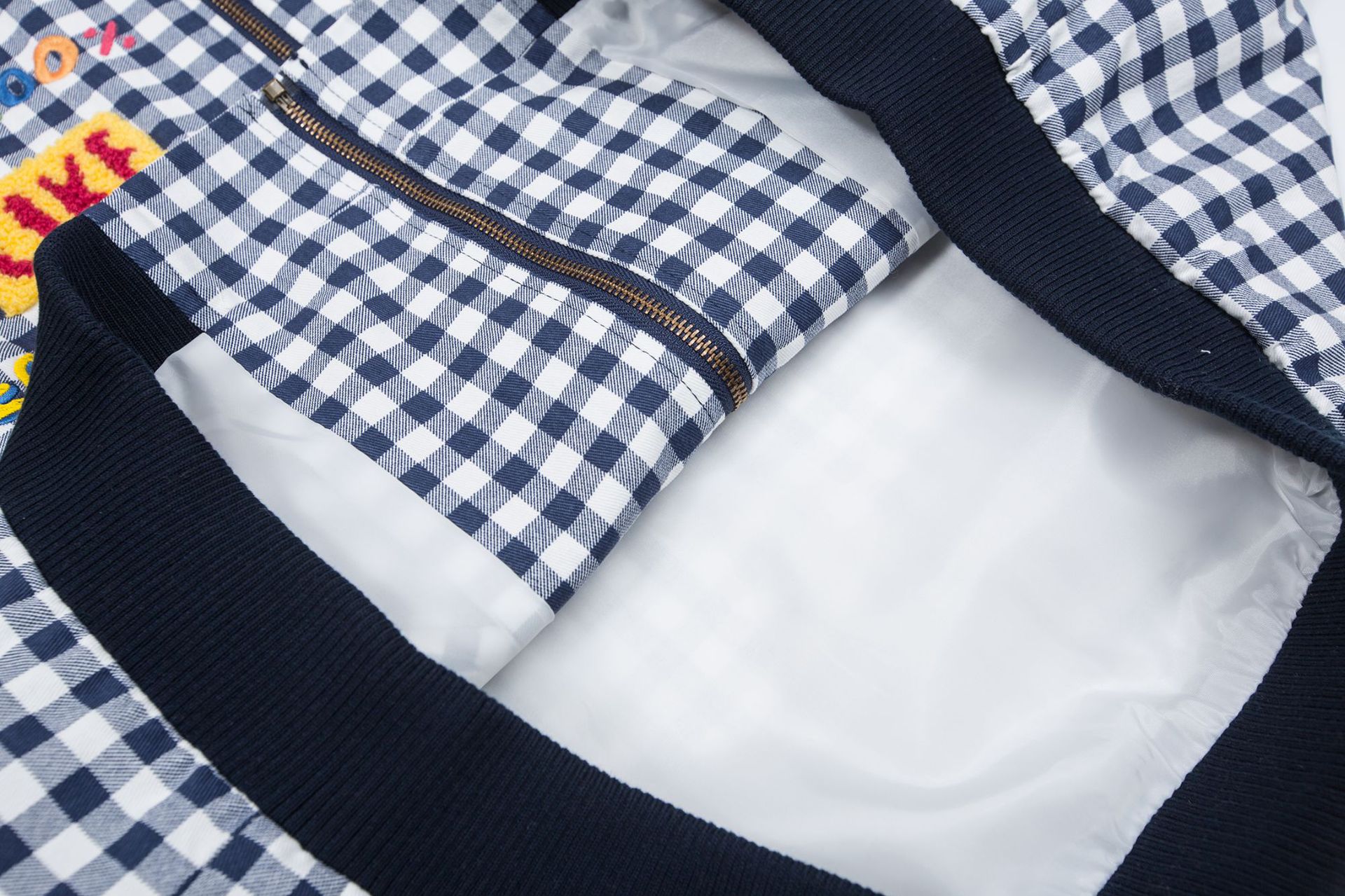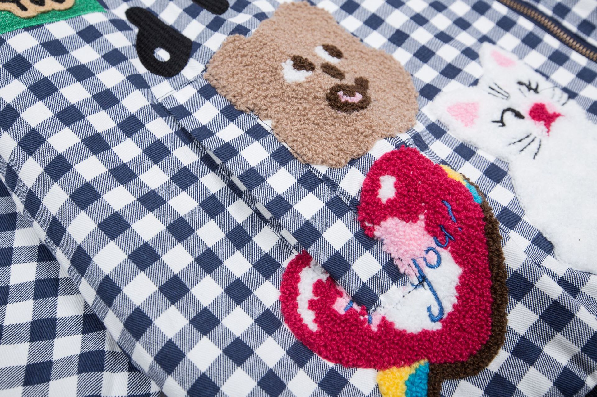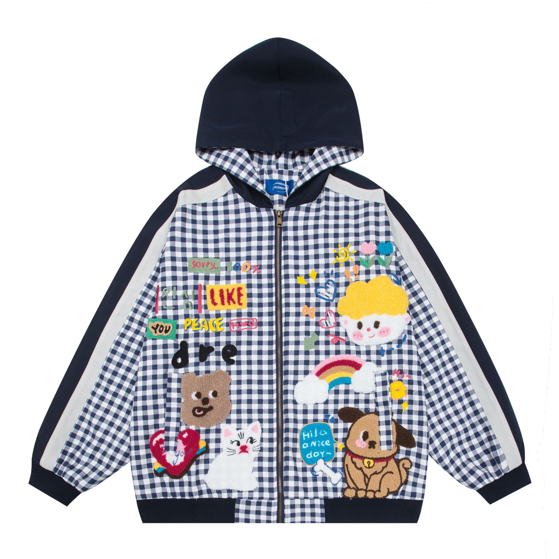 Fun cartoon embroidery plaid contrasting color splicing hooded jacket men's and women's trend loose couple jacket