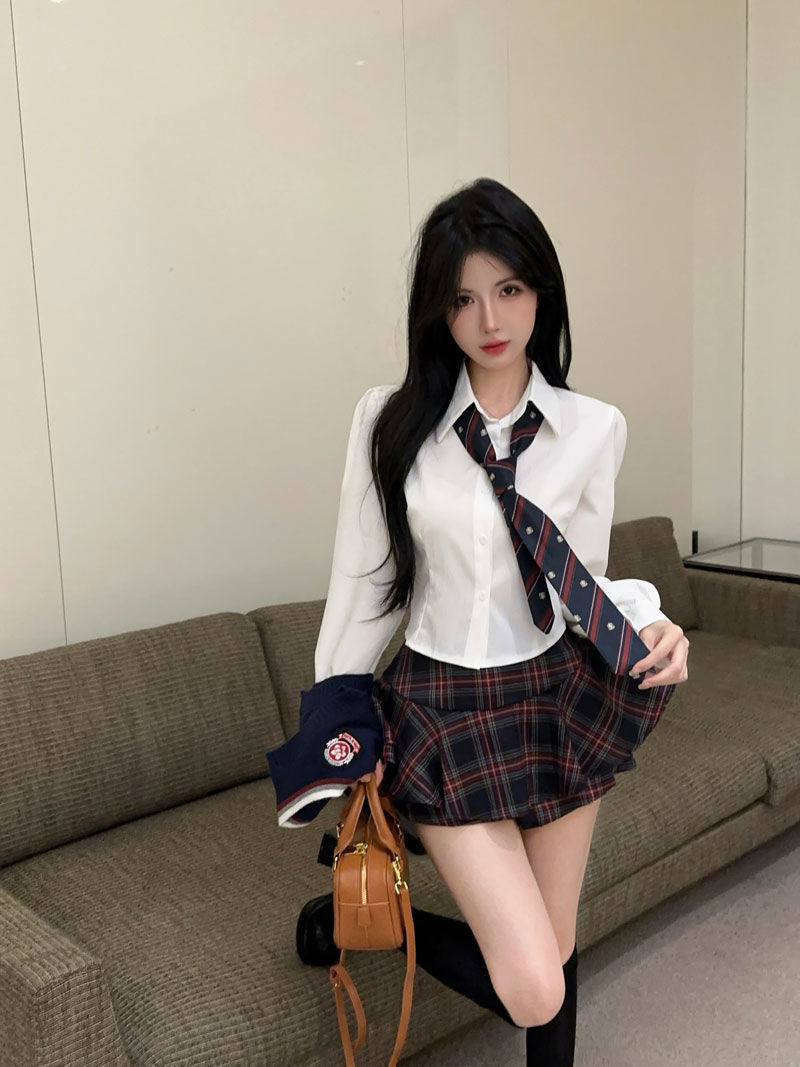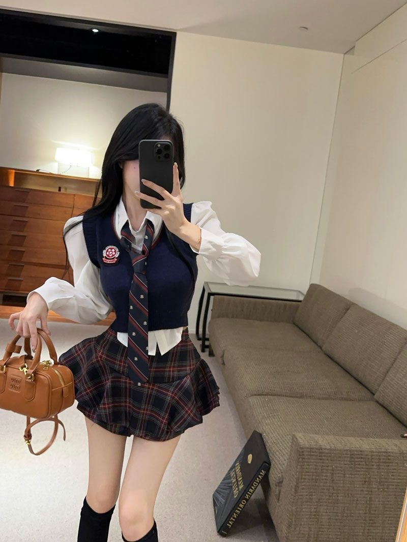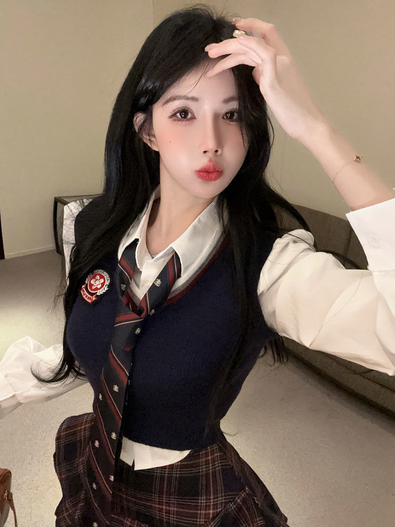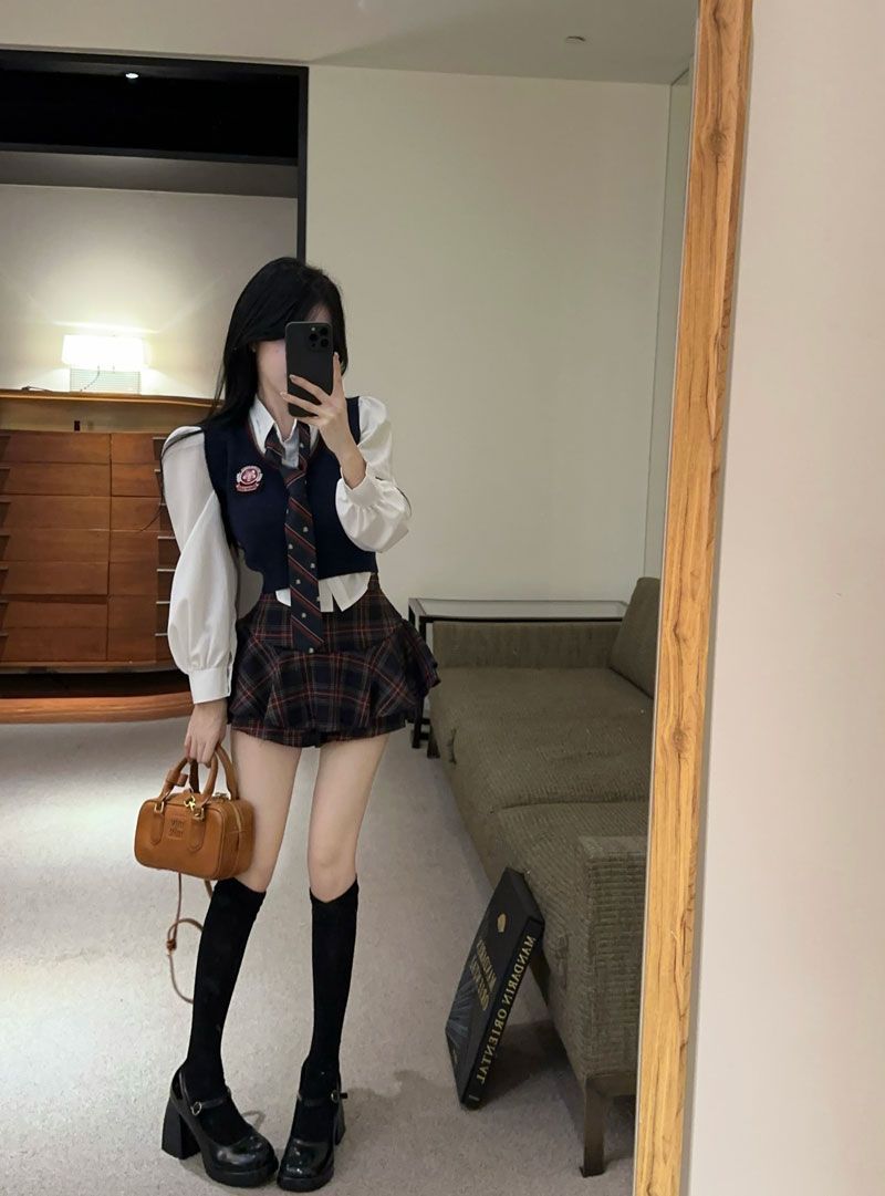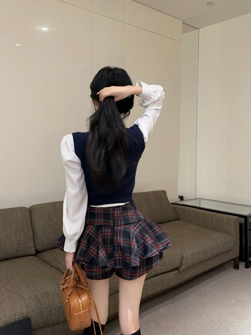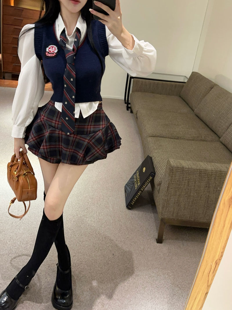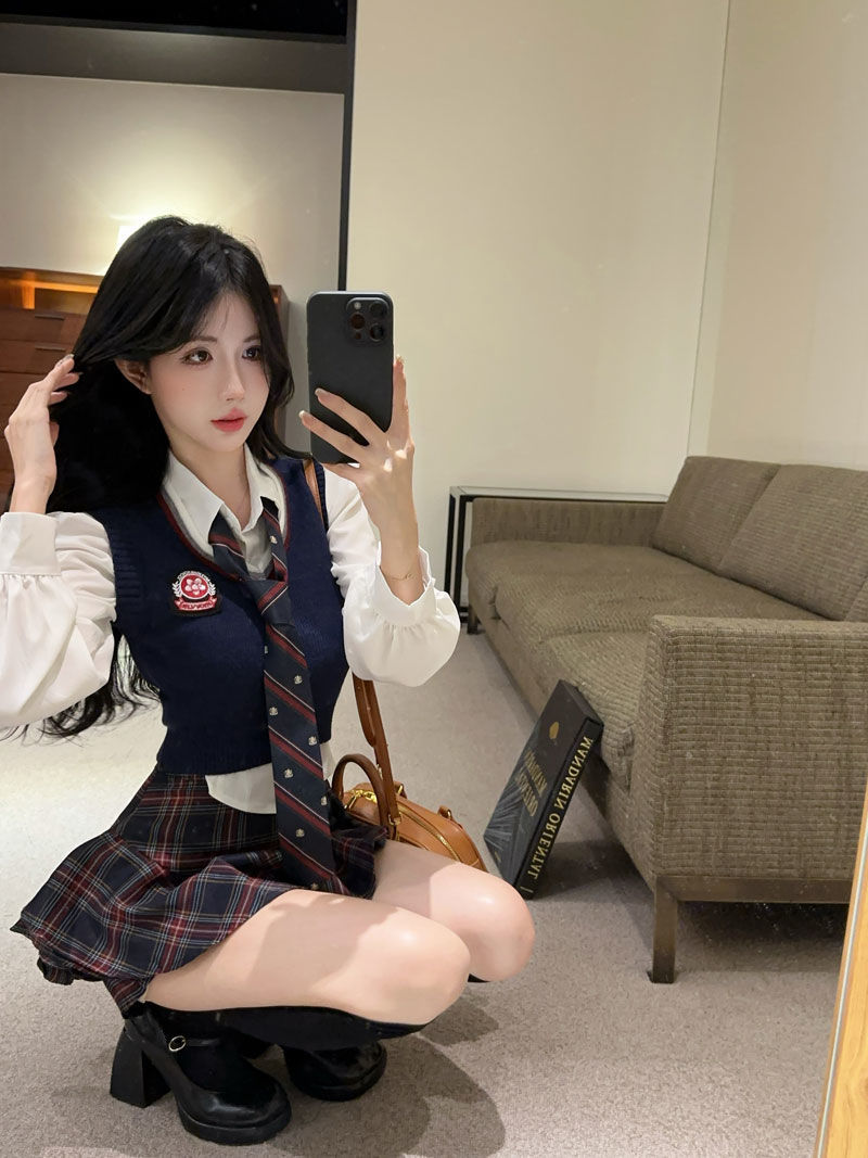 Vest ten ties shirt ten grid skirt [Recommended model three-piece set]