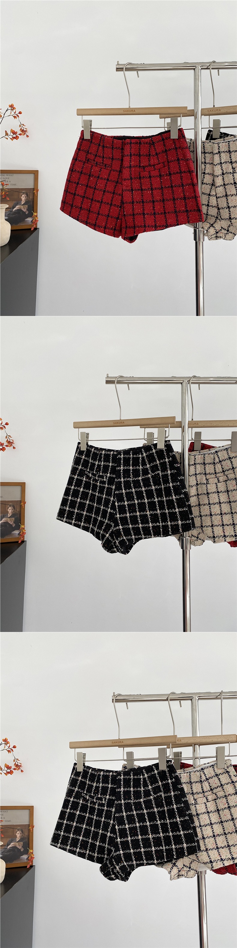 New temperament tweed plaid high waist thin versatile wide leg shorts women