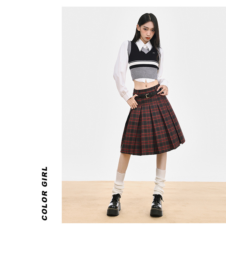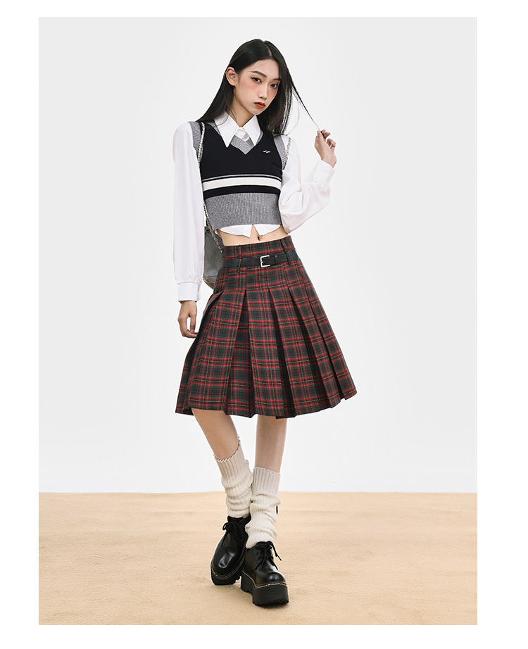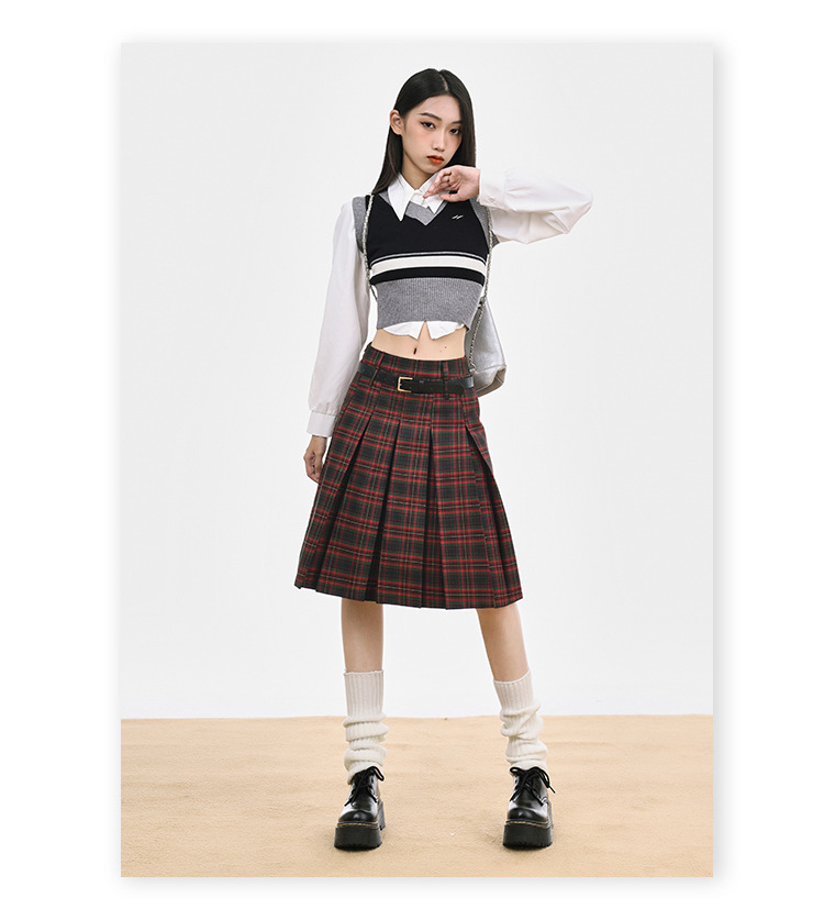 Vintage college plaid JK pleated skirt women autumn and winter red plaid