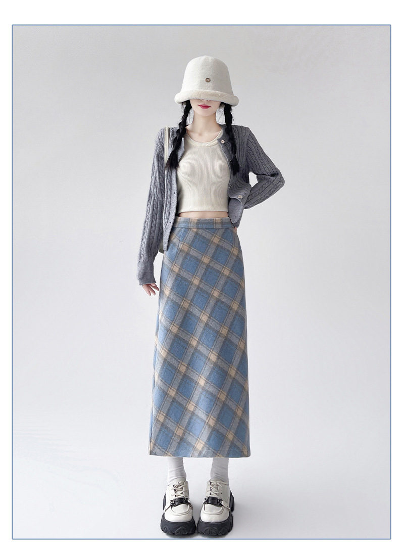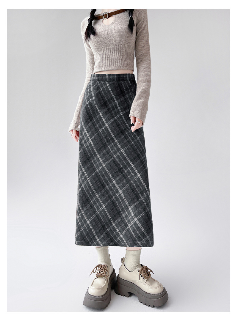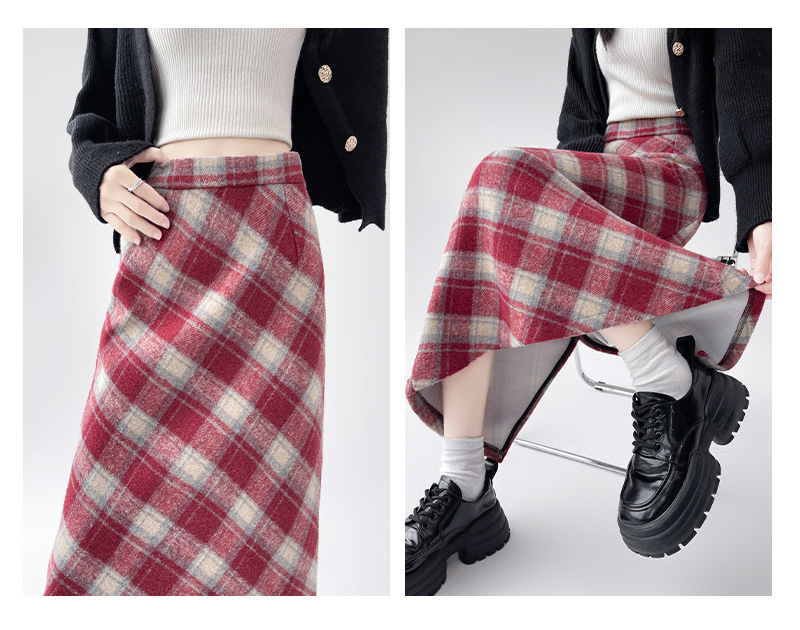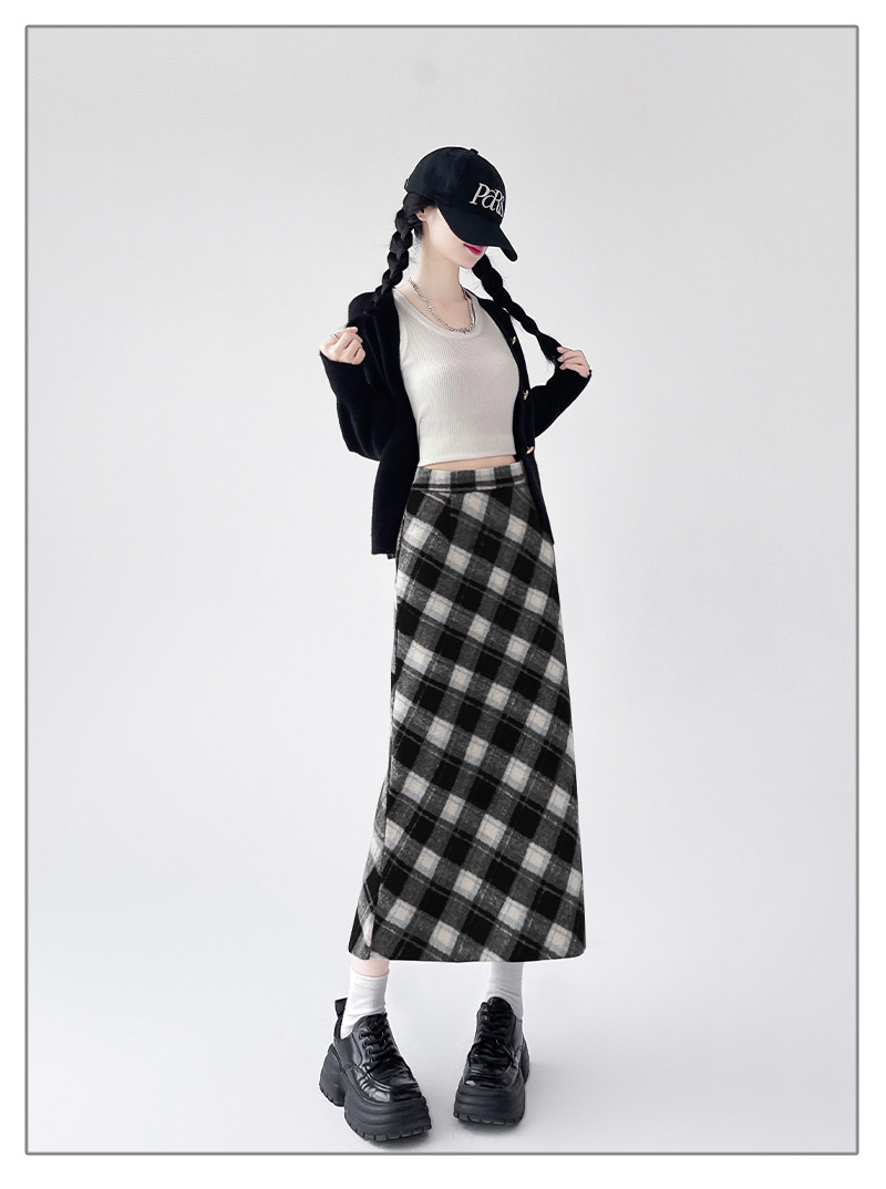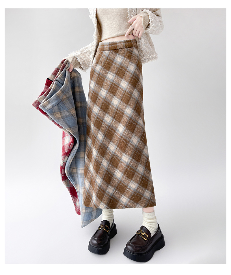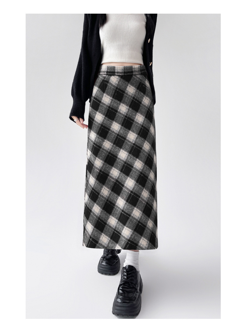Woolen plaid skirt women autumn and winter retro high-waisted and thin plaid medium and long hip skirt