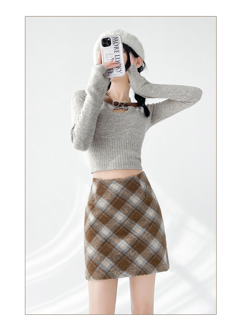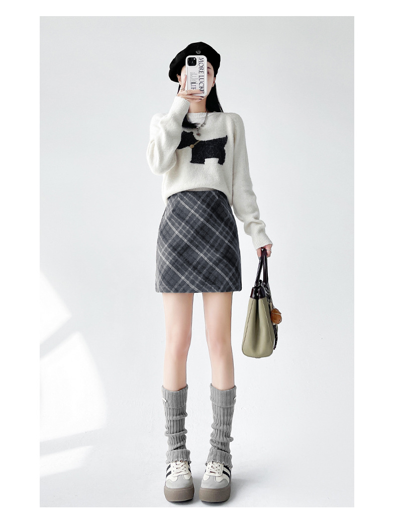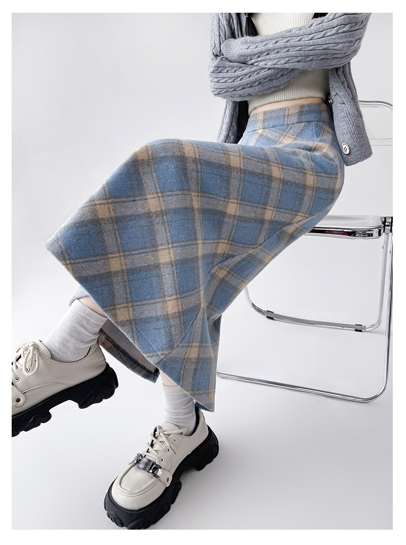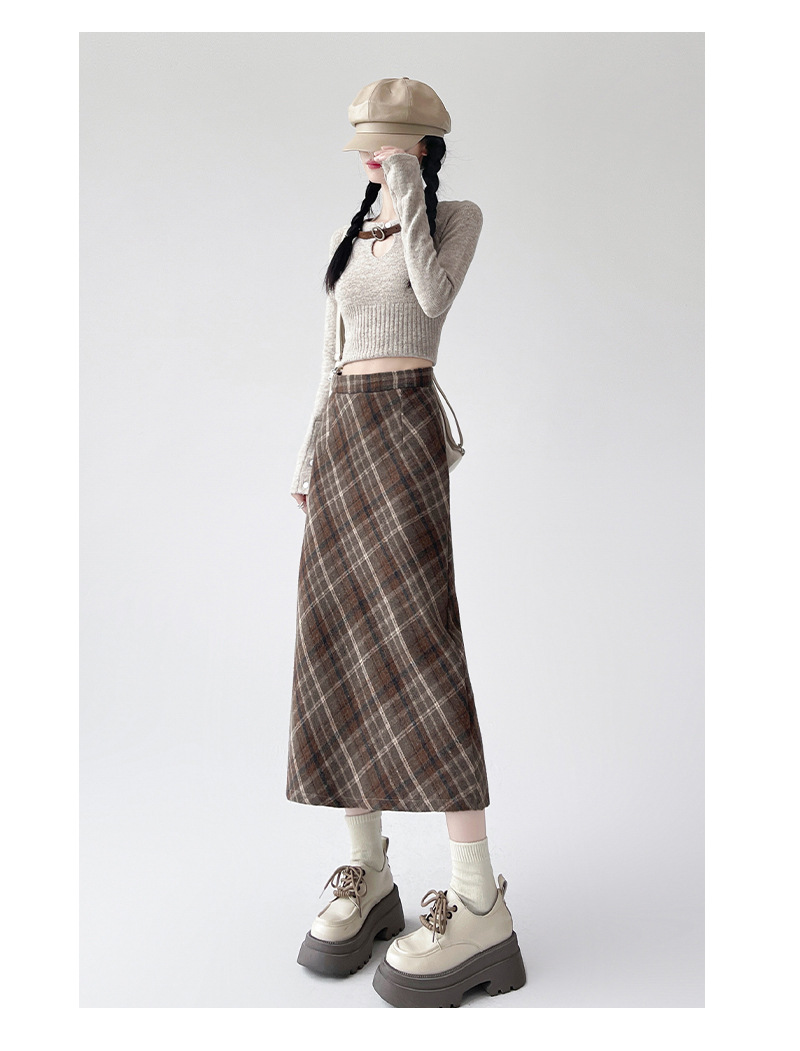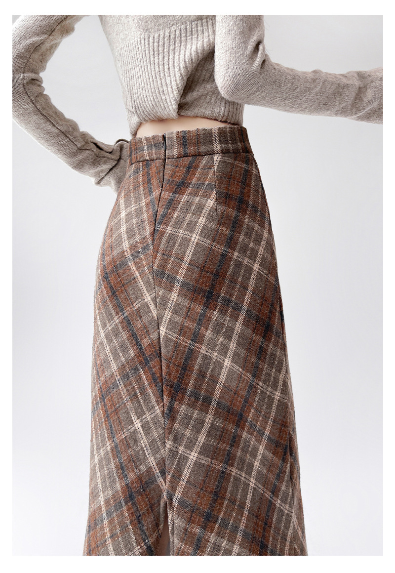 Woolen plaid skirt women autumn and winter retro high-waisted and thin plaid medium and long hip skirt
